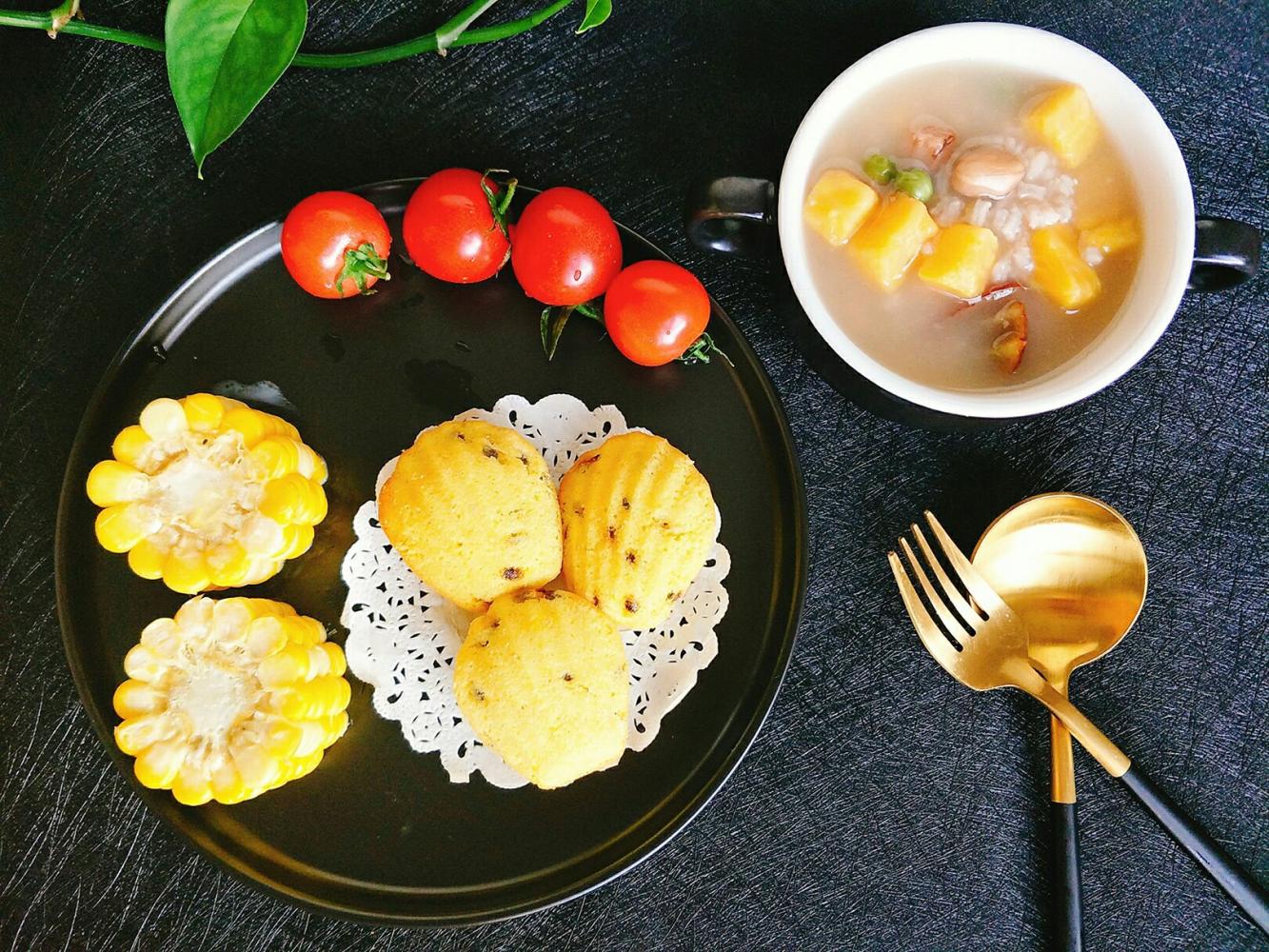 百香果玛德琳+圣女果+奶香玉米棒+红薯豌豆蜜枣粥
