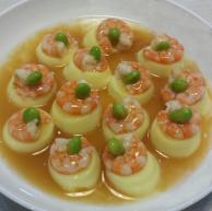 食材: 基围虾 日本豆腐 豌豆 生抽 水淀粉 盐 料酒 姜丝