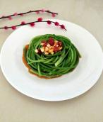 锅里做水烧开,滴入几滴的油,下蒜苔焯水一分钟。