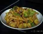 起油锅,姜片、蒜、干辣椒爆香,然后加入鸡爪翻炒