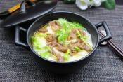 浓汤煮沸之后,把挂面放入浓汤锅煮熟,盛出碗里;