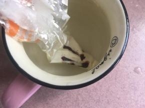 用剩下的淡奶油打发至7分发(我是在打第二次抹面奶油时一并打发,然后勺出放冰箱冷藏备用的,省着再重复打发)然后进行调色填充财神爷各部位~