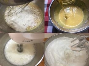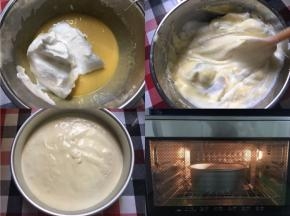 9、将1/3的蛋白加入到蛋黄糊里,并搅拌均匀,翻拌和切拌手法 10、最后将蛋黄糊全部倒入剩将1/3的蛋白加入到蛋黄糊里,并搅拌均匀,翻拌和切拌手法下的2/3的蛋白里,并搅拌均匀 11、倒入模具,刮一下面糊,让面糊平整点,并轻震2、3下 12、烤箱150度提前预热10分钟,将模具放入烤箱最中下层,150烤50分钟,烤好拿出来倒扣