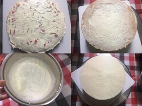 17、蛋糕坯抹上一层奶油,一层水果,再抹奶油,这样一层水果奶油夹心就做好了,接着又一层蛋糕坯一层水果奶油夹心……一直把2层水果夹心和3片蛋糕坯,完整放好 18、进行简单抹面 19、350g奶油是有剩的,将剩下的奶油简单抹面补漏……然后把蛋糕放冰箱冷藏(我是分2次抹面的,第一次简单抹面为了防止抹面过程中蛋糕的皮屑影响抹面的完美)这是第一次抹面补漏 20、150g淡奶油加入细砂糖打发至7分发(出现纹路,但可以轻微流动状态),进行第二次抹面,然后用软刮刀修整漂亮,然后放冰箱冷藏