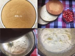 13、出炉倒扣2小时后,徒手脱模 14、蛋糕坯切3片,顶部不要,水果洗干净切粒 15、350g的淡奶油一次性倒入35g细砂糖,先高速打发,酸奶状时转中速,出现纹路后转低速 16、图上是全发,用来蛋糕夹层和裱花用