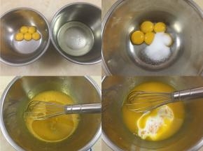 1、蛋清分离(记得打蛋盘中一定要无水无油!) 2、蛋黄里加入细砂糖,并搅拌均匀 3、加入玉米油,并搅拌均匀 4、加入纯牛奶,并搅拌均匀