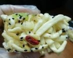 先加果仁进糖浆,因为果仁圆的易滑,趁着有温度易混合。最后关火加上炸好的面条搅拌