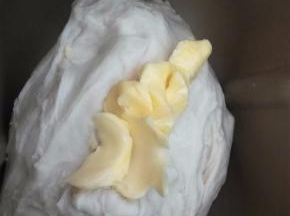 加入黄油后,要观察搅拌桶,如果边沿有黄油可以用手处理下,把黄油放在面团上,继续和面。