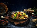 加入野山椒以及野山椒水,继续翻炒,让腊鸭心再次入味。
