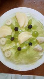 在这里有一点要注意的就是最下面一张的抹茶千层皮要用抹茶面糊煎,这样能保证它的颜色最绿