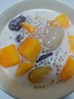 芋圆煮熟,用冷水过滤一遍;分别装入两个碗中,一个碗中加入纯牛奶;另一个碗中加入芒果汤底;加入炼奶或蜂蜜、水果、坚果调味即可。