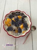 制作椰浆芒果汤底:把芒果果肉、纯牛奶、椰浆、细砂糖放入料理机中打成糊