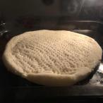 馅料做好之后饼底也差不多醒发好了,取出来看一下如果有蜂窝组织就可以用了。擀成与8寸披萨盘差不多大小的圆形,放入披萨盘中,用手按出边缘部分。