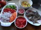 馅料部分:鲜虾去皮去虾线放入适量的大喜大烤肉酱腌上,青椒、胡萝卜切丝备用。洋葱切点洋葱碎,再切点圈做装饰。