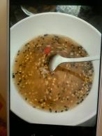 12、食用时,取两勺五香油茶放入碗中,倒入适量的沸水搅匀即可。