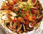 锅中垫一张锡纸,把煮好的花甲、姜、蒜,放在进去