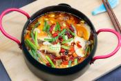 高汤煮沸,把炒好辣椒、鱼骨放入高汤,中小火熬煮出辣椒的香、麻、辣等味出来。