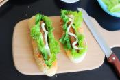 面包内侧放些沙拉,然后放入生菜,并用面包刀把把生菜压下去