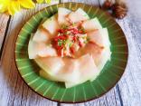 用冬瓜片夹住培根片,再叠放成型,就能让简单的食材令人眼前一亮,冬瓜片吸收了培根的肉汁,咀嚼之中,丝丝的肉香便在口腔中弥散开来。