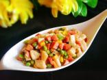 再放玉米粒,胡萝卜丁和豌豆。