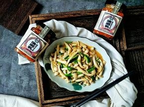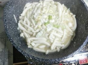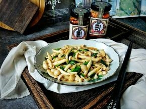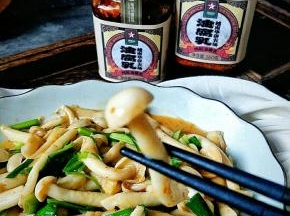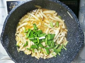 炒熟白玉菇后加入葱蒜翻炒均匀。