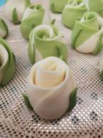 绿色面团擀薄片,切成长方体,切成如图的长三角状做叶子,叶子的长度根据玫瑰花的高度来切