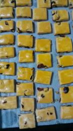 1.葡萄干清洗干净,放清水中浸泡15分钟,捞出控干水份。用朗姆酒泡味道更好。 2.烤好奶酥先不要移动,凉后再装饼干盒里。 3.这个方子可切出28块或者30块。个人感觉26~8块比较好,奶酥厚些好吃。