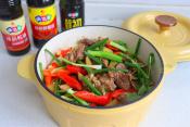 加入4勺生抽、2勺酱油、1勺蚝油,1小勺盐、小勺盐,翻炒至颜色微黄。
