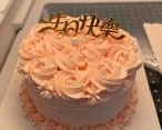 在裱花台上放上第一片蛋糕,在蛋糕表面涂上奶油