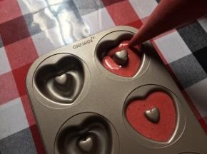 将面糊倒入一次性裱花袋中,并小心挤进模具中。学厨的爱心蛋糕模不仅外形漂亮,不沾功能扛扛滴!