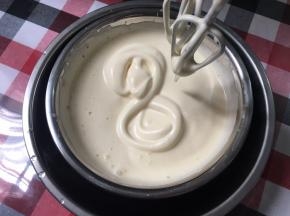 隔热水高速全蛋打发,直至出现明显纹路,3、5秒不会消失状态。